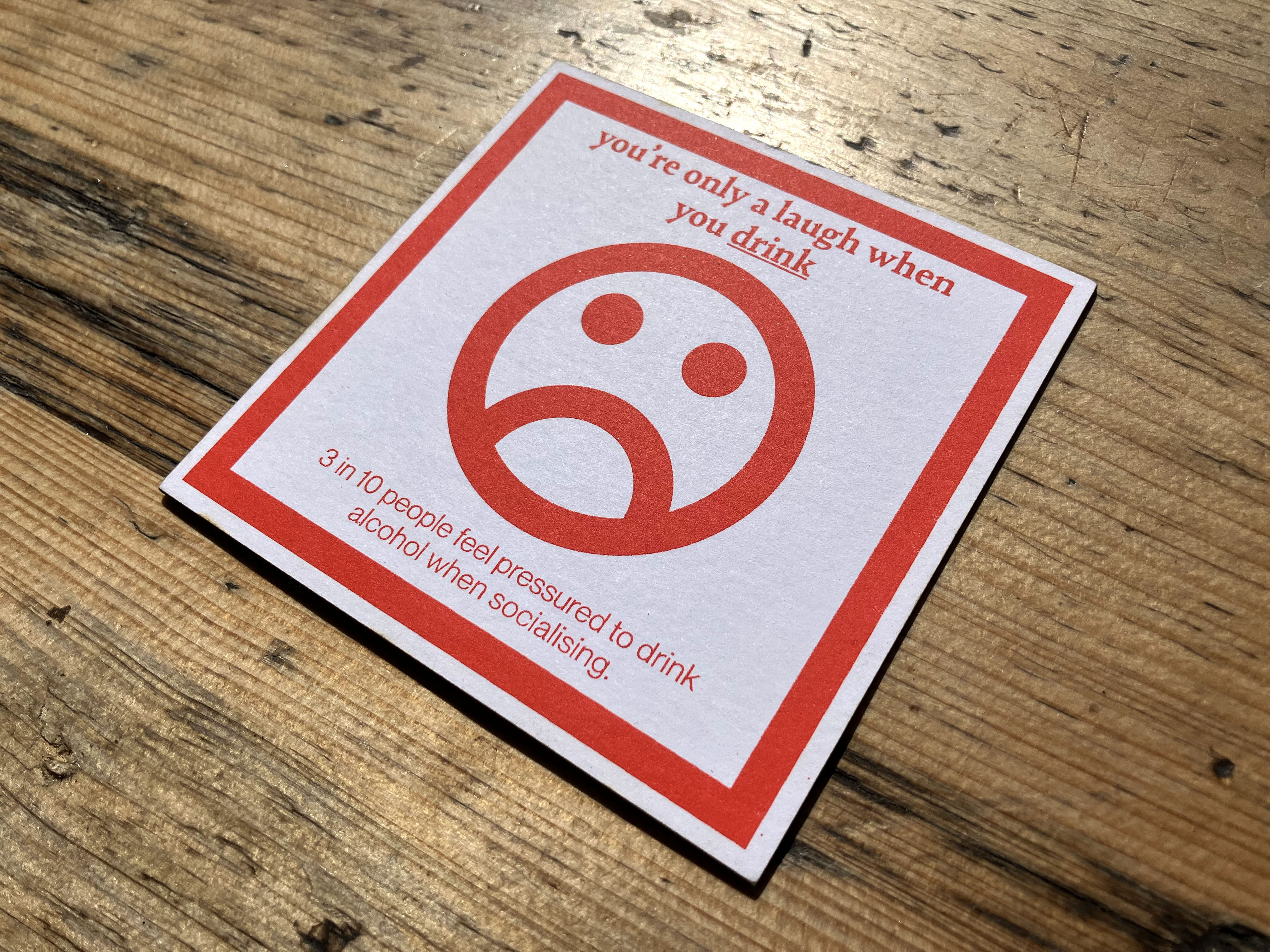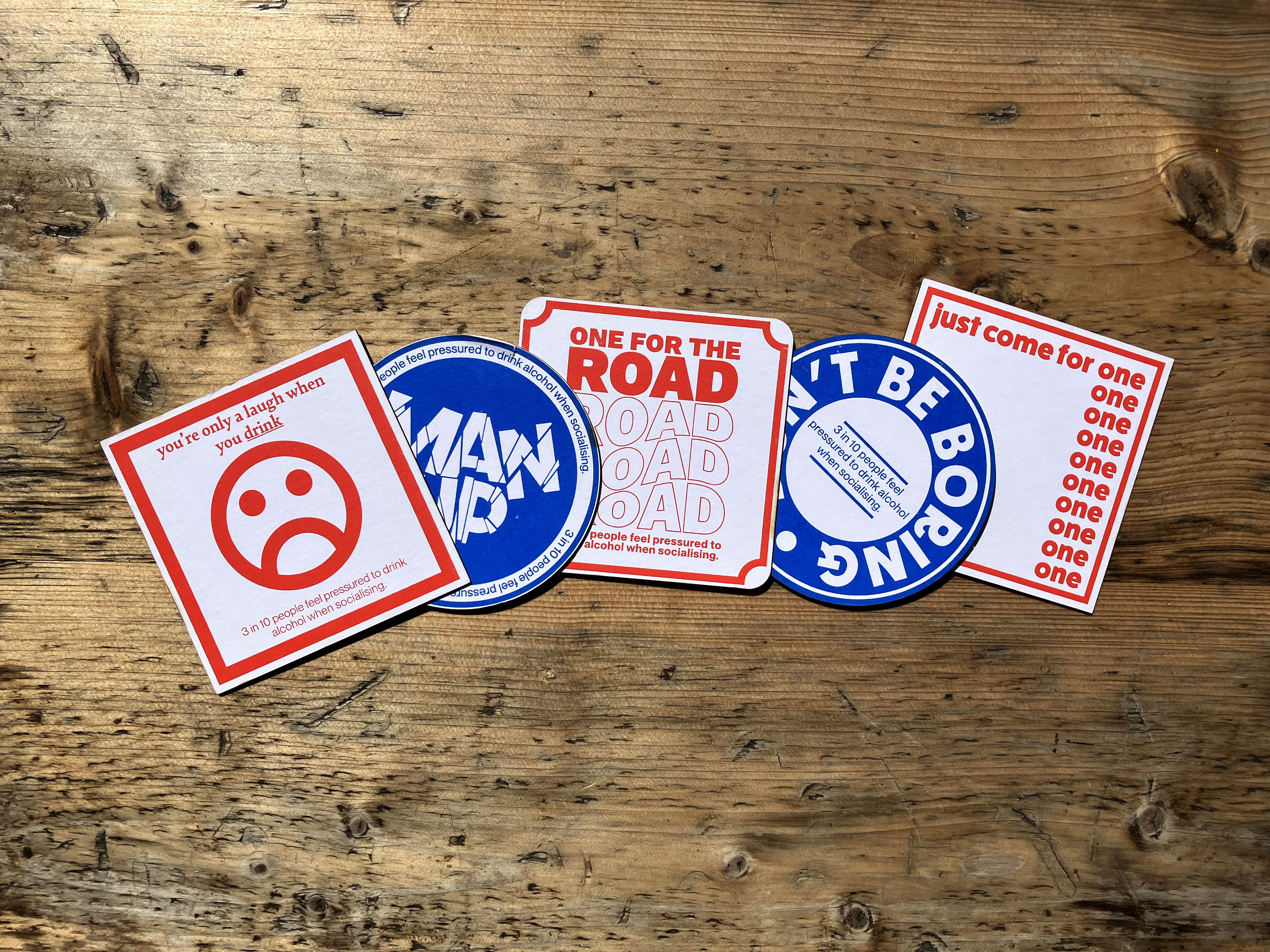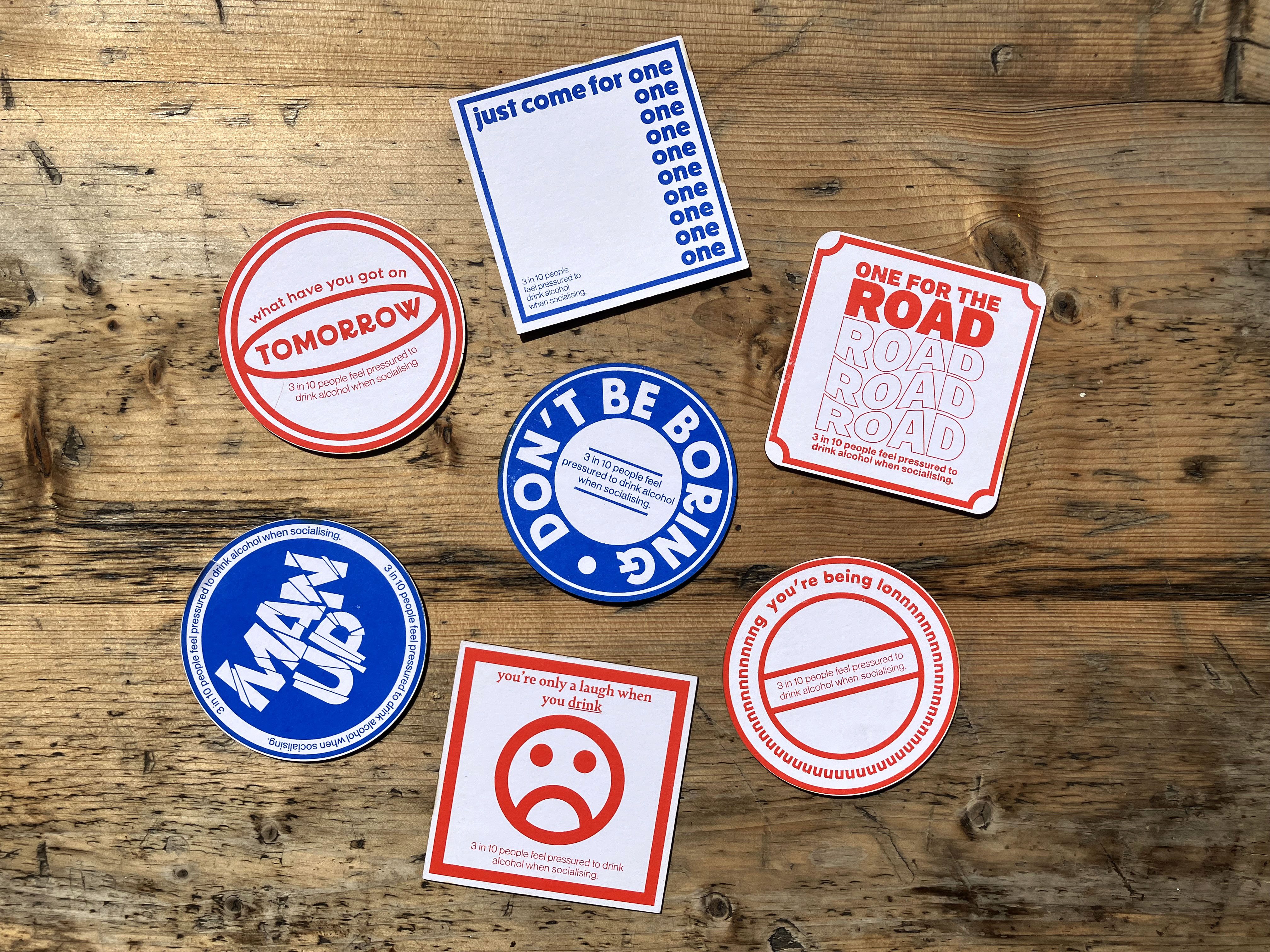 I designed and made these beer mats, aiming to address and challenge the language we often use to pressure our friends and family into drinking.